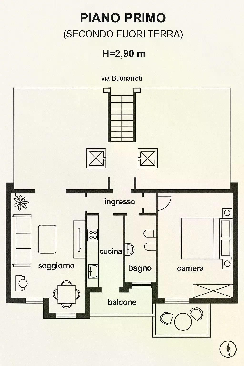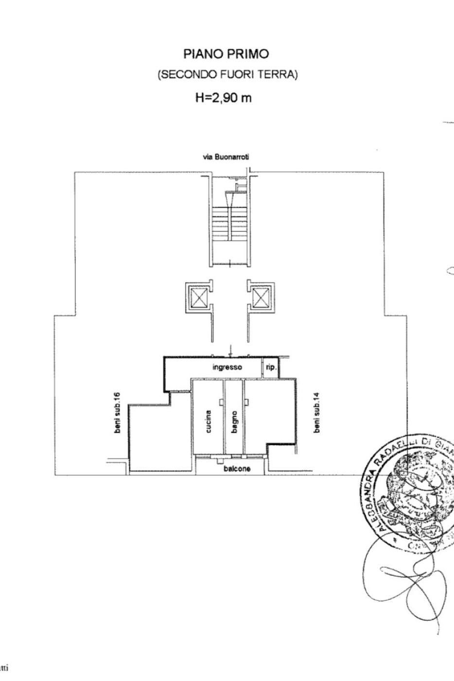 Ingresso Ripostiglio Camera matrimoniale con accesso al balcone Cucina abitabile Disimpegno, Ripostiglio Bagno con box doccia Soggiorno grande A completare la proprietà è presente un'ampia cantina di pertinenza.