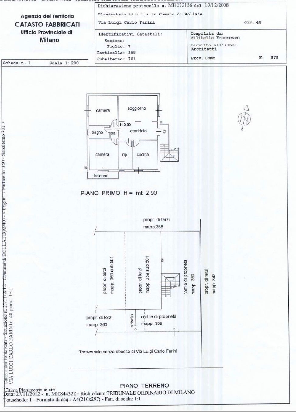 Appartamento sito in Bollate (MI) via Luigi Carlo Farini n. 48, al primo piano invilla di due piani, composto da ingresso su soggiorno, cucina, due servizi e due camere,balcone e cortile di proprietà; oltre a box di pertinenza al piano seminterrato con bagno.