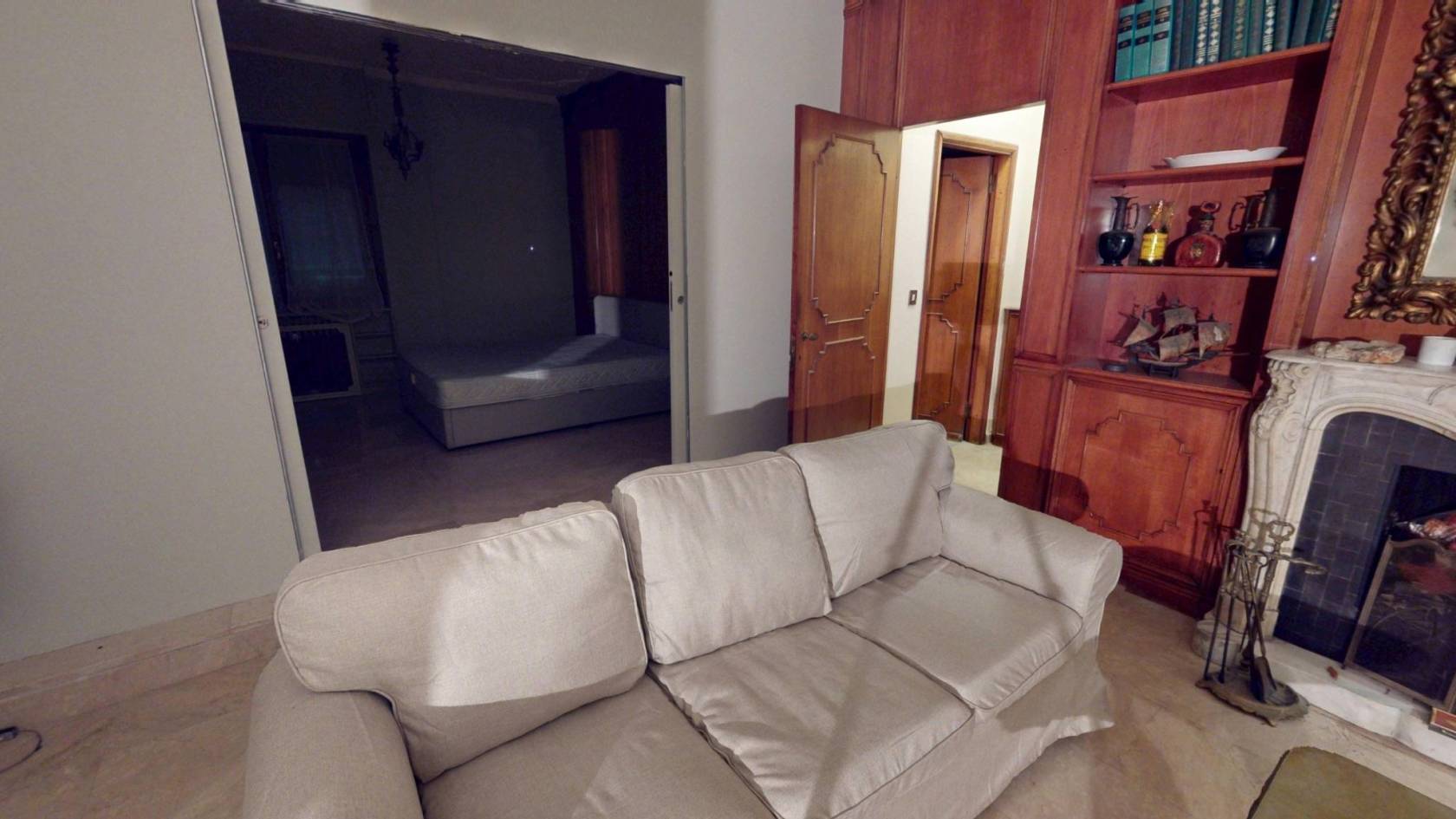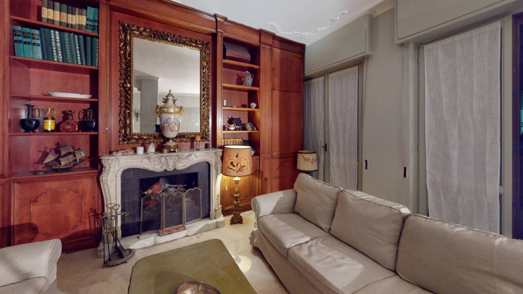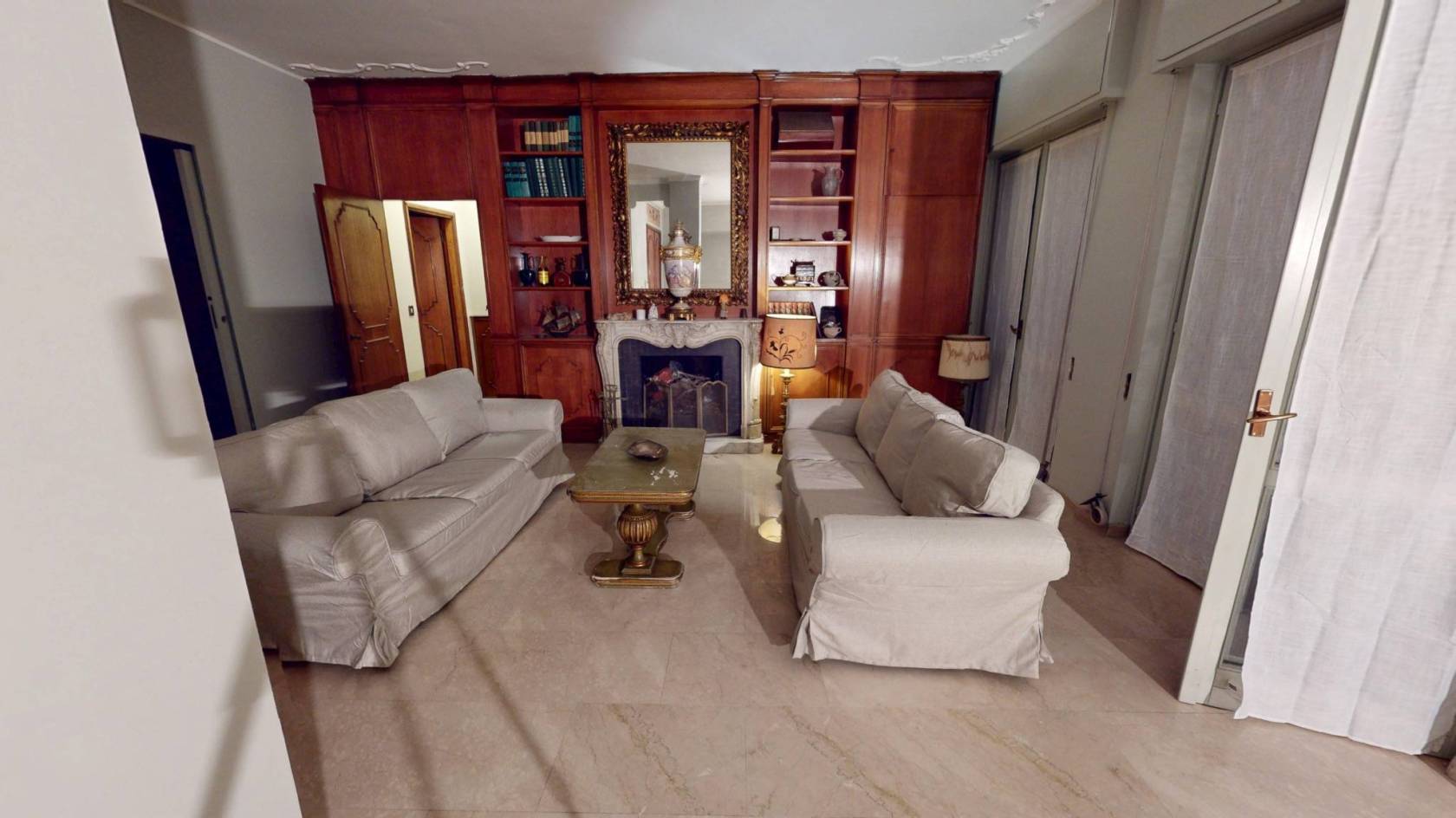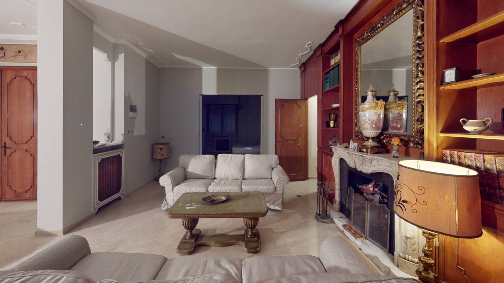 Il Salone delle Meraviglie: Oltre 40 mq dominati da una boiserie in legno a tutta altezza e da un camino monumentale in marmo bianco, cuore pulsante della zona living.