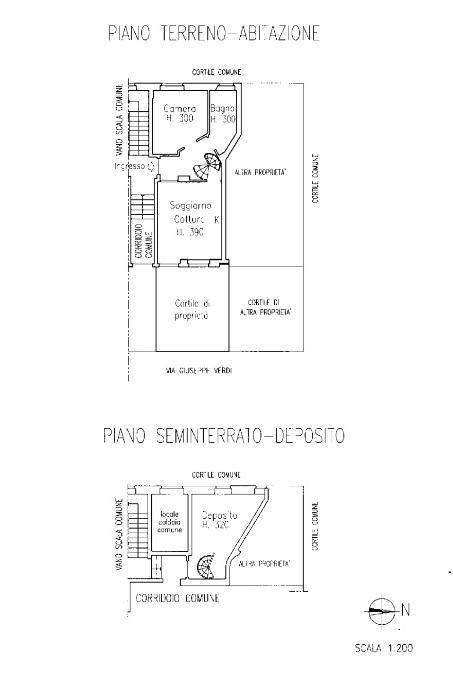 unita' abitativa ai piani T/S1 composto da due locali con relativi servizi con locale deposito, forometria per scala interna e annesso cortile pernenziale