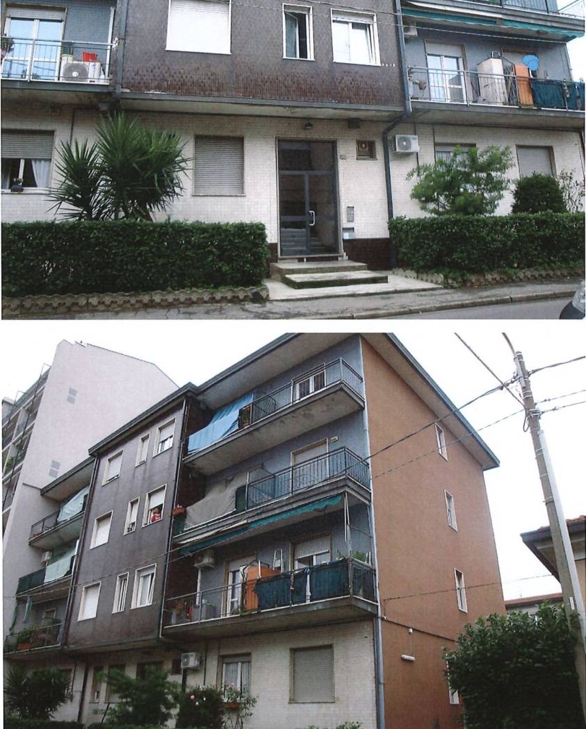 Appartamento posto al piano primo composto da cucina con balcone, due camere da letto, un locale di servizio con balcone, un ripostiglio e un bagno, con pertinenziale cantina. Box ad uso autorimessa di circa 11 mq., situato nel piano seminterrato del cortile condominiale con accesso da una rampa carrabile dalla via Macchiavelli.